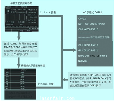 所以只要將齒輪加工一個齒的加工程式固化到子程序o0792中,并且在主程序執(zhí)行過程中,能夠不斷將y軸的分度數(shù)據(jù)賦值到變量地址#13125里,即可實現(xiàn)整個齒輪的連續(xù)淬火加工控制。