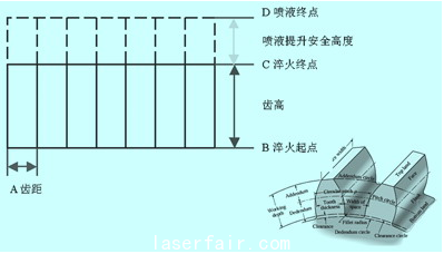 直齒淬火的一個淬火周期過程如下:z軸快速進給到淬火起點b——x軸淬火感應(yīng)頭進給到齒根——z軸以淬火速度提升,淬火感應(yīng)頭由淬火起點b上升到淬火終點c——z軸,繼續(xù)以快速進給提升到噴液安全距離d——x軸淬火感應(yīng)頭退回到齒頂---y軸分度一個齒距a。直齒齒輪一個加工周期的g代碼編輯如下: