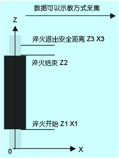以下零件為例,淬火區(qū)域為紅色部分,g代碼設(shè)計如下,其中x,z軸的數(shù)據(jù)(如下例中的z1、x1等)最終用戶可以通過圖紙計算得出,也可以通過cnc的示教功能采集得出。