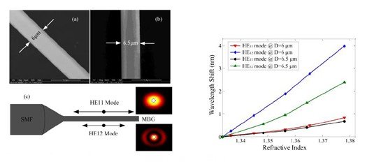 光互聯(lián)及光信號處理團隊的張新亮教授、張羽博士等人提出了在微納光纖中引入更加精細的周期性結(jié)構(gòu),并且據(jù)此和新加坡南洋理工大學沈平教授、林波等合作制作了微納光纖布拉格光柵(MFBG)這一新穎的器件。該器件采用248nm的KrF準分子激光器,借助相位掩模板,在直徑為微米量級的具有光敏性的微納光纖上刻制了折射率周期性變化的布拉格光柵。MFBG具有不同于普通光纖布拉格光柵(FBG)的獨特的反射特性,在其反射譜中,除了具有對應(yīng)基模的反射峰(類似于普通FBG)外,還有對應(yīng)于高階模式的反射峰;并且高階模式的反射峰具有靈敏度很高的折射率傳感特性,在實驗中獲得了102nm/RIU的傳感靈敏度。