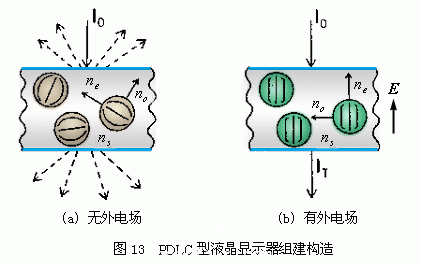 3. “高分子散布型液晶顯示器”(Polymer dispersed liquid crystal liquid crystal display),簡(jiǎn)稱“PDLC型液晶顯示器”。這種顯示器的液晶組件構(gòu)造如圖13所示。高分子的單體(monomer)與液晶混合后夾在兩片玻璃中間,做成一液晶盒。這種玻璃與上面所用的相同,是表面上先鍍有一層透明而導(dǎo)電的薄膜作電極。但是不需要在玻璃上鍍表面配向劑。此時(shí)將液晶盒放在紫外燈下照射使個(gè)單體連結(jié)成高分子聚合物。在高分子形成的同時(shí),液晶與高分子分開而形成許多液晶小顆粒。這些小顆粒被高分子聚合物固定住。 當(dāng)光照射在此液晶盒上,因折射率不同,而在顆粒表面處產(chǎn)生折射及反射。經(jīng)過多次反射與折射,就產(chǎn)生了散射(scattering)。此液晶盒就像牛奶一樣呈現(xiàn)出不透明的乳白色。