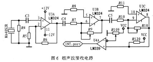 圖6示出為超聲波接收電路。超聲波接收換能器采用MA40S2R,對換能器接收到的信號采用集成運算放大器LM324進(jìn)行信號放大,經(jīng)過三級放大后,通過電壓比較器LM339將正弦信號轉(zhuǎn)換為TTL脈沖信號。INT_Port與單片機中斷管腳相連,當(dāng)接收到中斷信號后,單片機立即進(jìn)入中斷并對超聲波信號進(jìn)行處理和判斷。