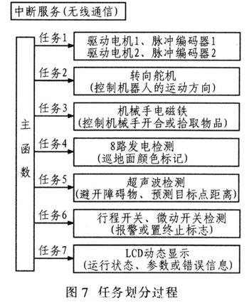 根據(jù)各個控制功能和微控制器的資源結(jié)構(gòu)對任務(wù)進(jìn)行劃分,共劃分為7個應(yīng)用任務(wù),其劃分過程如圖7所示。無線串行通信采用中斷接收方式,保證數(shù)據(jù)接收的實時性。