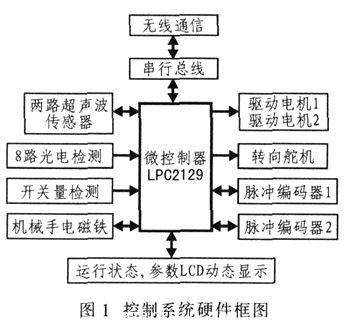 根據(jù)競技機器人的功能要求進(jìn)行總體設(shè)計,將各個功能進(jìn)行模塊化,其控制系統(tǒng)硬件框圖如圖1所示。中央處理器采用微控制器結(jié)構(gòu),用以控制外圍設(shè)備協(xié)調(diào)運行。舵機控制機器人的運動方向;驅(qū)動電機電動機采用輸出軸配有光電編碼器的小型直流電機驅(qū)動車輪旋轉(zhuǎn)。電磁鐵作為機械手夾緊的執(zhí)行元件。設(shè)置了兩路超聲波傳感器、8路光電檢測輸入和8路開關(guān)量檢測接口。整個機器人的運行狀態(tài)和運行參數(shù)通過LCD動態(tài)顯示。