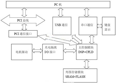 本運(yùn)動(dòng)控制器的硬件結(jié)構(gòu)主要分為如下幾個(gè)模塊:DSP+CPLD 主控模塊,包括 DSP 核心 模塊和 CPLD 驅(qū)動(dòng)與擴(kuò)展模塊;通信接口模塊,包括 PCI 總線、USB 總線和串口;I/O 輸入輸 出接口模塊以及外圍存儲(chǔ)器模塊,包括 SRAM 和 FLASH。本運(yùn)動(dòng)控制器的硬件結(jié)構(gòu)如圖 1 所示。