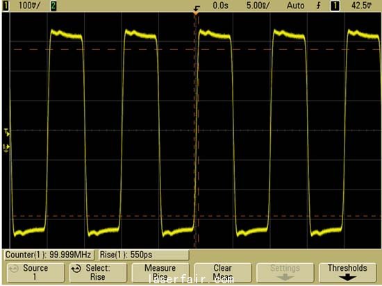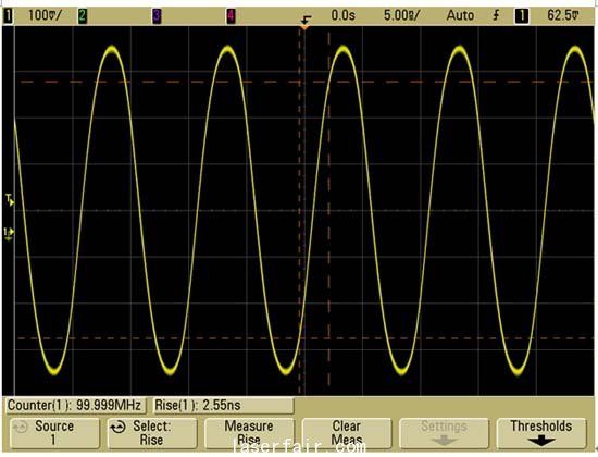 從圖中可以看出,該示波器主要只通過了該時鐘信號的100MHz基本頻率成分,因此,時鐘信號顯示出來大約是正弦波的形狀。帶寬為100MHz的示波器對許多時鐘速率在10MHz 到 20MHz 范圍的基于MCU的8bit設(shè)計而言可能非常合適,但對于這里測量的100MHz的時鐘信號就明顯不夠了。 圖4給出了利用Agilent公司500MHz帶寬的示波器MSO6054A測量同一信號的結(jié)果。