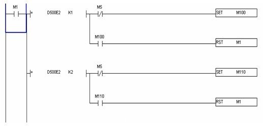 當(dāng)自動運(yùn)行開始M1標(biāo)志有效,E2是自動程序順序指針初始值是1代表程序執(zhí)行用戶所輸入的第一個動作,每執(zhí)行一個動作E2自增一也就是D500E2地址偏移一個位置。M100為調(diào)用子程序標(biāo)志。每一個動作就是一個子程序。