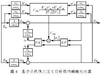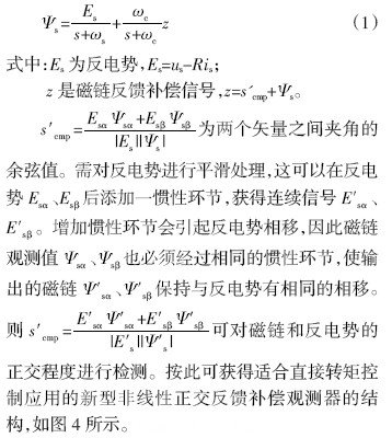 文獻(xiàn)[12]對(duì)永磁同步電機(jī)直接轉(zhuǎn)矩控制中磁鏈觀測(cè)這一關(guān)鍵技術(shù)進(jìn)行了研究,設(shè)計(jì)了一種新型磁鏈觀測(cè)器———非線性正交反饋補(bǔ)償磁鏈觀測(cè)器。磁鏈觀測(cè)是直接轉(zhuǎn)矩控制技術(shù)中關(guān)鍵部分,直接關(guān)系到電機(jī)的運(yùn)行性能和直接轉(zhuǎn)矩控制方案效果,適合永磁同步電機(jī)直接轉(zhuǎn)矩控制應(yīng)用的新型非線性正交反饋補(bǔ)償磁鏈觀測(cè)器算法可以用式(1)表示。