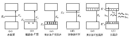 當(dāng)光照射到圖(3)所示的各種半導(dǎo)體時(shí),在a—e的五種情況下,半導(dǎo)體中只有一個(gè)費(fèi)米能級,在它之上沒有電子,在它之下已充滿電子,因此不會發(fā)生電子向沒有被電子占據(jù)的空態(tài)躍遷,而只會將外來光子吸收。在圖(3f所示的情況下有所不同,兩個(gè)費(fèi)米能級使得導(dǎo)帶中有自由電子,價(jià)帶中有空穴。如果外來光子的能量與上能帶中電子和下能帶中空穴之間的能量差相同,則會誘導(dǎo)導(dǎo)帶中電子向價(jià)帶中空穴躍遷而發(fā)出一個(gè)同樣的光子。當(dāng)外來光子的能量大于兩費(fèi)米能級 #p#分頁標(biāo)題#e#之間的能量差,或者小于導(dǎo)帶最下端的能級與價(jià)帶最上端的能級之間的能量差 時(shí),不會誘導(dǎo)受激輻射。所以,在半導(dǎo)體中產(chǎn)生光放大的條件是在半導(dǎo)體中存在雙簡并能帶,并且入射光的頻率滿足