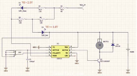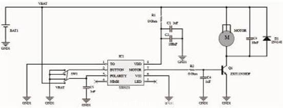 對于非充電路的設(shè)計,只需將NIMH管腳處于懸空的狀態(tài),通過BUTTON來控制MOTOR管腳的輸出,從而控制馬達(dá)旋轉(zhuǎn)或關(guān)閉。