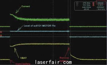 圖4是將開關(guān)至于ON的位置,插拔電池時電池電壓和輸出電流以及SX8121的MOTOR管腳電壓的變化。插入電池正常啟動后,MOTOR管腳輸出高電平,通過三極管輸出大約1.1A的電流,而啟動瞬間的峰值則超過2A,如圖5所示。