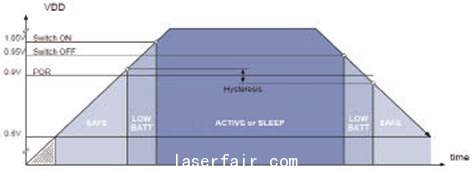 當(dāng)電池的電壓高于0.6V~0.7V時,SX8121進(jìn)入安全模式,此種模式下所有管腳處于高阻狀態(tài),這保證了電池接入時芯片的安全啟動。當(dāng)電池電壓低于0.9V時處于低電壓模式,芯片將不會對接在BUTTON管腳上的按鍵操作出任何響應(yīng)。MOTOR管腳和LED管腳均處于關(guān)閉狀態(tài),芯片每秒鐘檢測一次電池電壓VDD,當(dāng)VDD高于VON(典型值1.05V)時立即進(jìn)入激活或休眠狀態(tài)。芯片根據(jù)POLARITY管腳上的電平高低決定(上電過程中)當(dāng)VDD高于VON時芯片處于激活還是休眠狀態(tài),此時芯片將會對BUTTON管腳電平的高低變化進(jìn)行響應(yīng),并在激活和休眠狀態(tài)之間進(jìn)行切換。