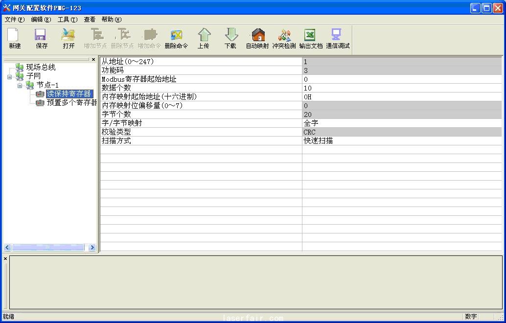其中,圖9中的“節(jié)點-1”表示連接的從站設(shè)備地址為1,配置了“讀保持寄存器”和“預(yù)置多個寄存器”兩條命令,表示網(wǎng)關(guān)讀取了從站對應(yīng)地址的數(shù)據(jù),并且能夠輸出數(shù)據(jù)到Modbus從站設(shè)備,命令配置方法如下: