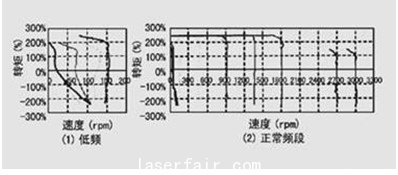 無速度傳感器的矢量控制變頻器不僅改善了轉(zhuǎn)矩控制的特性,而且改善了針對(duì)各種負(fù)載變化產(chǎn)生的不特定環(huán)境下的速度可控性。圖3-1所示,為某品牌無速度傳感器變頻器產(chǎn)品在低頻和正常頻段時(shí)的轉(zhuǎn)矩測(cè)試數(shù)據(jù)(電機(jī)為5.5kW/4極)。從圖中可知,其在低速范圍時(shí)同樣可以產(chǎn)生強(qiáng)大的轉(zhuǎn)矩。在實(shí)驗(yàn)中,我們同樣將2Hz的矢量變頻控制和V/F控制變頻進(jìn)行比較發(fā)現(xiàn),前者具有更強(qiáng)的輸出力矩,切削力幾乎與正常頻段(如30Hz或50Hz)相同。