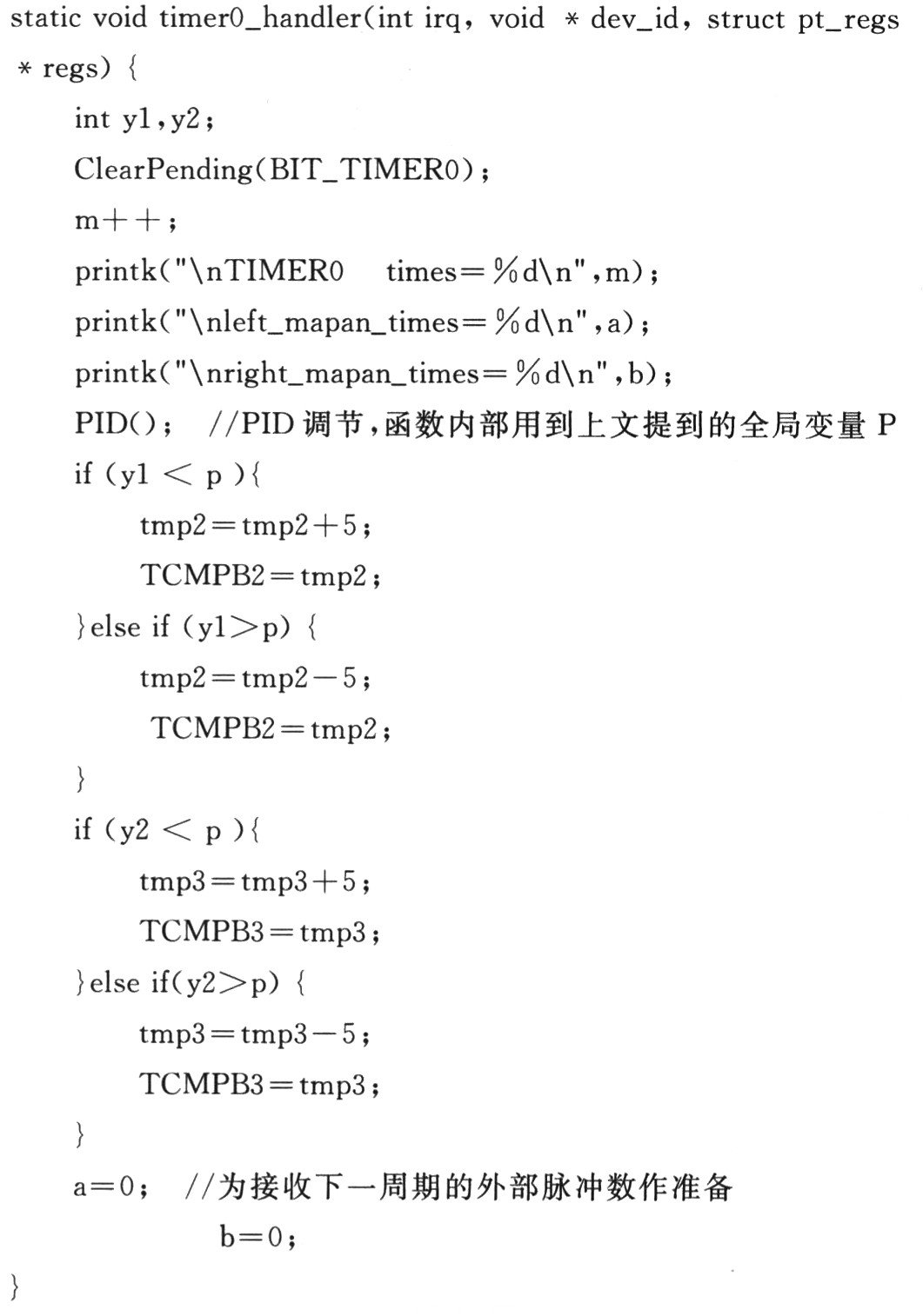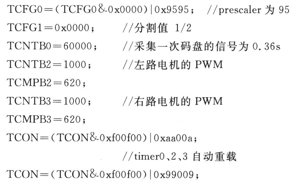 以下所有的函數(shù)都是在ioctl()中實現(xiàn)的。在Dcmo-tor_STart里調(diào)用timer0_2_3_start(),設(shè)置timer0為接收兩路電機的碼盤信號,并檢測電機速度;timer2、timer3提供2路PWM輸出,并設(shè)置定時器自動重載。具體實現(xiàn)如下: