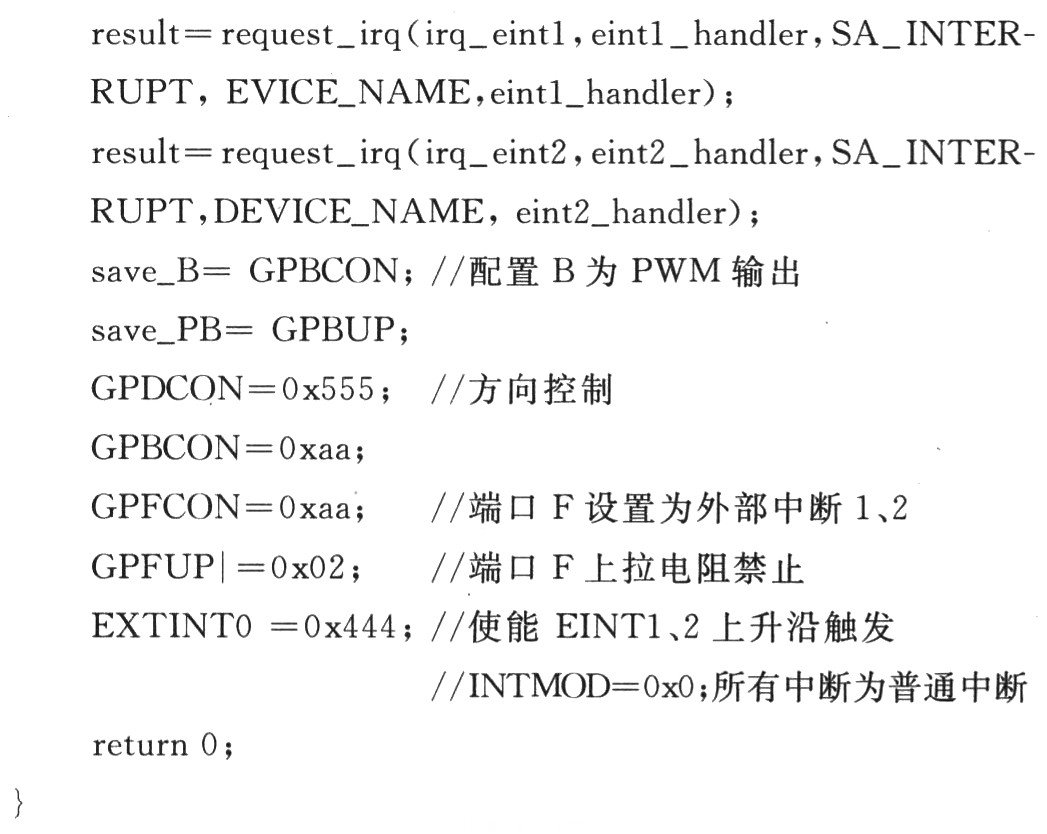 設(shè)備打開的時候就會調(diào)用dcmotor__open函數(shù)進(jìn)行申請中斷號。帶內(nèi)存管理的單元的地址映射,設(shè)置B端口的2、3引腳為PWM輸出,端口D配置為電機使能剎車制動引腳。