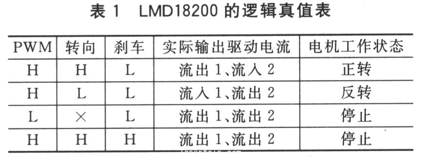 本設(shè)計采用的LMD18200的真值表如表1所列。通過ARM的I/0口(例如D口的DO~3)來控制電機的工作狀態(tài)。