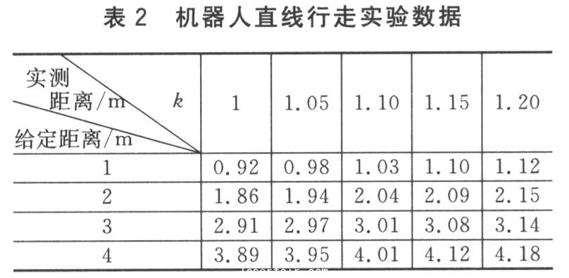 智能機器人選用的光碼盤精度為256線,即256脈沖/轉(zhuǎn)。電機減速比為1:71,車輪半徑R為6 CM,車輪間距為41.1 cm.車輪轉(zhuǎn)一圈所產(chǎn)生的脈沖數(shù)n=71×256=18 176,可以得到每個脈沖之間的距離d=27πR/n=2×3.14×0.06/18 176=0.207×10-4m,即每個脈沖對應(yīng)的控制精度達(dá)0.02 mm.考慮到負(fù)載變化的影響,理論值與實際值會出現(xiàn)誤差,因此在控制精度d前乘以一個修正系數(shù)k.表2為機器人直線行走的實驗數(shù)據(jù)??梢钥闯?,k為1.10誤差較小,最接近真實值,因此該值就是所需的比例系數(shù)。