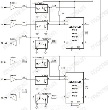 一.特點 本電路采用四隔離型DC-DC模塊與光電隔離器件獲得四路相互隔離的485接口,降低了成本和簡化電路,并且有效地抑制了電路周圍的電磁干擾和消除接地環(huán)路,保護系統(tǒng)電...