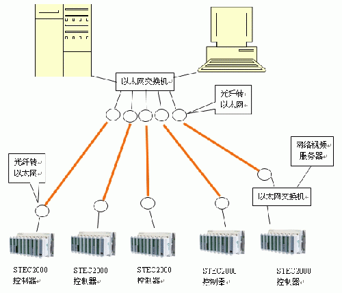 該項目共有15個下位站,采用15套STEC2000控制器。同時,其中幾個下位站安裝有網(wǎng)絡視頻服務器。由于STEC2000有完整的以太網(wǎng)和TCP/IP支持,STEC2000與視頻服務器通過一個以太網(wǎng)交換機就可以以共享的方式共用同一條光纖的通訊資源。