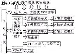 數(shù)控火焰切割機(jī)機(jī)械部分主要由底座、龍門式移動框架、火焰噴頭、傳動機(jī)構(gòu)和三個步進(jìn)電機(jī)組成(圖略),以實現(xiàn)對平面板材零件的切割加工。三個步進(jìn)電機(jī)分別控制龍門框架的前后移動(Y電機(jī))、火焰噴頭的左右(X電機(jī))和上下移動(Z電機(jī)),X、Y、Z三軸可以實現(xiàn)聯(lián)動控制。數(shù)控系統(tǒng)的硬件結(jié)構(gòu)如圖1所示。該控制系統(tǒng)以IPC(486以上CPU,8MB以上內(nèi)存,500MB以上硬盤)作為主機(jī),除了IPC的固有硬件(CPU主板、TVGA卡、電源),只在插槽中增加了一塊32位光隔離I/O.TIMER(并行輸入輸出/定時器)卡。由該卡的I/O并行口控制三個步進(jìn)電機(jī)的運(yùn)行、乙炔開關(guān)、乙炔點(diǎn)火、切割氧開關(guān)以及接收工作臺的限位行程開關(guān)信號、坐標(biāo)零位信號。由板上的8253定時器作為步進(jìn)電機(jī)運(yùn)行中斷服務(wù)程序的中斷定時器,時鐘頻率取2MHz。通過計算機(jī)的鍵盤實現(xiàn)對控制系統(tǒng)的操作。三個移動方向步進(jìn)電機(jī)的脈沖當(dāng)量均為0.01mm。由于486以上PC機(jī)高的運(yùn)行速度,完全可以用一個CPU完成從系統(tǒng)程序管理到加工控制的所有工作,沒有必要采用上、下位機(jī)的多CPU結(jié)構(gòu)。