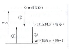 其中 ,AB 點(diǎn)之間為往復(fù)運(yùn)動(dòng) ,M28 起動(dòng)往復(fù)運(yùn)動(dòng) ,M29 終止其往復(fù)運(yùn)動(dòng)并執(zhí)行回零 , 本應(yīng)用實(shí)例中暫停時(shí)間 (Ta) 由 D 參數(shù)修改。