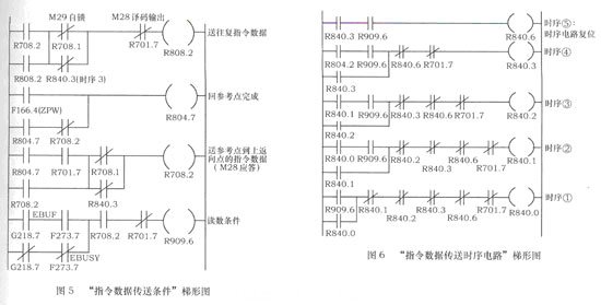 根據(jù)PMC軸的控制要求,我們?cè)O(shè)計(jì)了指令數(shù)據(jù)傳送圖(見(jiàn)圖4)、“指令數(shù)據(jù)傳送條件”梯形圖(見(jiàn)圖5)、“指令數(shù)據(jù)傳送時(shí)序電路”梯形圖(見(jiàn)圖6)和“指令數(shù)據(jù)傳送”梯形圖(略)。
