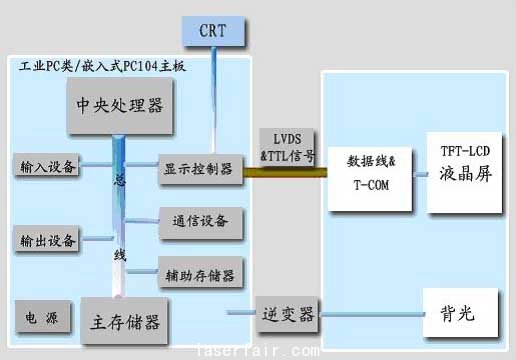 所謂工業(yè)PC/嵌入式PC104主板搭配方案主要指通過內(nèi)嵌CPU及顯示控制功能的IPC(工業(yè)主板)或ARM直接控制液晶屏實現(xiàn)顯示。如原理框圖1。
