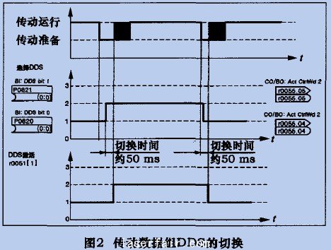 用于控制傳動(dòng)系統(tǒng)和輸入給定值的參數(shù)(連接器和開(kāi)關(guān)量連接器輸入)分配給命令數(shù)據(jù)組(CDS)??刂泼詈徒o定值的信號(hào)源用BICO技術(shù)互連。傳動(dòng)數(shù)據(jù)組用BICO參數(shù)P0820和P0821來(lái)切換。激活的傳動(dòng)數(shù)據(jù)組顯示在參數(shù)r0051中。傳動(dòng)數(shù)據(jù)組可在“準(zhǔn)備”狀態(tài)下切換,此項(xiàng)切換約需 50 ms。如圖2所示。
