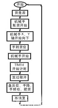 步進電機驅(qū)動縱軸上升,另一個步進電機驅(qū)動橫軸開始向前走;轉(zhuǎn)盤直流電機轉(zhuǎn)動使機械手整體運動,轉(zhuǎn)到貨物接收處;步進電機再次驅(qū)動縱軸下降,到達指定位置后,氣閥放氣,機械手松開貨物;系統(tǒng)回位準(zhǔn)備下一次動作。