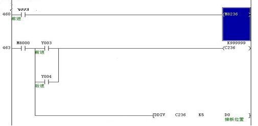 編程中其它應(yīng)注意的問(wèn)題。一是雙線圈問(wèn)題。本工程中利用條件跳轉(zhuǎn)和步進(jìn)指令避免了雙線圈問(wèn)題。二是誤信號(hào)問(wèn)題。編碼器是一種比較精密的光電產(chǎn)品,受振動(dòng)時(shí)不可避免的會(huì)出現(xiàn)誤信號(hào),而切紙機(jī)在執(zhí)行裁切動(dòng)作時(shí)會(huì)造成很大振動(dòng),如果忽視這個(gè)現(xiàn)象,定位精度和執(zhí)行機(jī)構(gòu)當(dāng)前位置的顯示都會(huì)不準(zhǔn)確。本工程中處理方法參見(jiàn)上面例子程序圖1,只有Y3、Y4接通,即只有進(jìn)給機(jī)構(gòu)前進(jìn)和后退時(shí)才讓C236進(jìn)行計(jì)數(shù),這樣就屏蔽了裁切時(shí)震動(dòng)造成的誤信號(hào)。