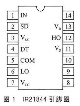 IR21844采用CMOS工藝制作,邏輯電路和功率電路共用一個電源,電壓范圍為10~20 V,適應(yīng)TTL或CMOS邏輯信號輸入;