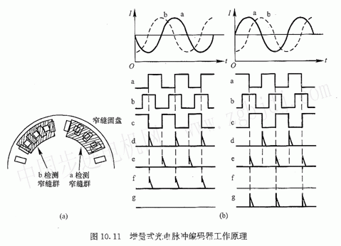1)工作原理由圖10.11所示,由一個中心有軸的光電碼盤,其上有環(huán)形通、暗的刻線,有光電發(fā)射和接收器件讀取,獲得四組正弦波信號組合成A、B、C、D。每個正弦波相差90。相位差(相對于一個周波為360°),將C、D信號反向,疊加在A、B兩相上,可增強(qiáng)穩(wěn)定信號;另每轉(zhuǎn)輸出一個z相脈沖以代表零位參考位。