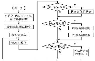 LPC2101配置使用Keil ARM開發(fā)環(huán)境中標(biāo)準(zhǔn)的啟動代碼,設(shè)定CCLK時鐘為60 MHz,PCLK時鐘為15 MHz。相關(guān)測試代碼包括main.c,adc.c,timer0.c,motor.c,uart.c,bcd.h等。