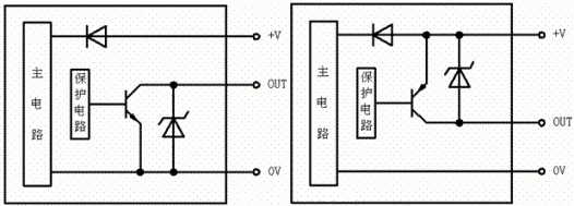 從圖8和圖9可以看出,NPN集電極開路輸出電路的輸出OUT端通過開關(guān)管和0V連接,當(dāng)傳感器動作時(shí),開關(guān)管飽和導(dǎo)通,OUT端和0V相通,輸出0V低電平信號;PNP集電極開路輸出電路的輸出OUT端通過開關(guān)管和+V連接,當(dāng)傳感器動作時(shí),開關(guān)管飽和導(dǎo)通,OUT端和+V相通,輸出+V高電平信號。