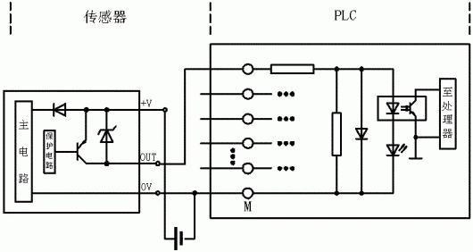 PNP集電極開路輸出為+V高電平,當(dāng)輸出OUT端和PLC輸入相連時(shí),電流從PLC的輸入端流入,從PLC的公共端流出,此即為PLC的源型電路的形式,即:PNP集電極開路輸出只能接源型或混合型輸入電路形式的PLC,連接圖如圖11所示: