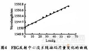 由實驗可得,在砝碼質(zhì)量從0 g增加到60 g的過程中,粘貼在懸臂梁上的FBG1中心波長漂移0.716 nm,圖4所示為FBG1中心波長隨砝碼質(zhì)量變化的曲線圖。由圖4可知,懸臂梁上的FBG中心波長變化量與懸臂梁自由端所施加的砝碼質(zhì)量成較好的線性關(guān)系,并且具有較高的靈敏度。