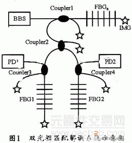 光纖布拉格光柵傳感器(FBGS)是用光纖布拉格光柵(FBG)作敏感元件的功能型光纖傳感器,可用于直接檢測溫度和應(yīng)變,以及與溫度和應(yīng)變有關(guān)的其他許多物理量和化學(xué)量的間接測量。在光纖布拉格光柵傳感器的應(yīng)用研究中,波長解調(diào)是一個重要的方面。目前限制光纖光柵傳感器應(yīng)用的最主要障礙是傳感信號的解調(diào)。波長解調(diào)方法主要有光譜儀、斜邊濾波法、可調(diào)諧濾波法、干涉掃描法、匹配光柵法等。但是,在這幾種方法中,光譜儀成本較高,斜邊濾波法的分辨率較小,干涉儀沒有好的重復(fù)性,而可調(diào)諧濾波器的掃描周期較長。因此,近年來,匹配光柵法越來越受到人們的青睞。為此,文中介紹了一種簡單、廉價且由兩個并聯(lián)的匹配光柵解調(diào)來檢測光纖光柵傳感器的系統(tǒng)設(shè)計方法。