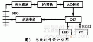 匹配光柵反射回來的光入射到光電探測器(PD)上可轉(zhuǎn)換為電信號。光電轉(zhuǎn)換部分和信號采集部分主要完成對PD輸出電信號的采集,采集到的信號再轉(zhuǎn)化為#p#分頁標(biāo)題#e#數(shù)字信號由DSP進(jìn)行處理。DSP主要完成數(shù)據(jù)的插值運算和尋峰處理,并根據(jù)處理結(jié)果反饋給DSP,由DSP依照反饋信號控制步進(jìn)電機(jī)完成下一步的解調(diào)工作,其系統(tǒng)硬件框圖如圖3所示。