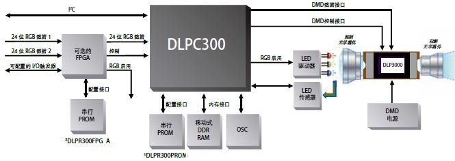 王洋昔介紹說(shuō),DLP LightCrafter平臺(tái)的核心是參考了德州儀器DLP 0.3 WVGA芯片組而進(jìn)行設(shè)計(jì)的。該芯片組過(guò)去應(yīng)用于DLP Pico投影機(jī)中,可支持可靠、高速的空間光調(diào)制器。該芯片組有兩個(gè)主要組件:一個(gè)是DLP3000,它是由415,872個(gè)微鏡組成的MEMS設(shè)備;另一個(gè)是DLPC300,它是一個(gè)可提供便捷的用戶界面的數(shù)字式控制器,能確保微鏡陣列可靠、高速的運(yùn)行。整套芯片組的設(shè)計(jì)宗旨就是讓工程師能夠快速、方便、可靠地控制DMD(DMD是一個(gè)具備電流輸入、光學(xué)輸出功能的內(nèi)存器件),以便縮短產(chǎn)品開(kāi)發(fā)周期。