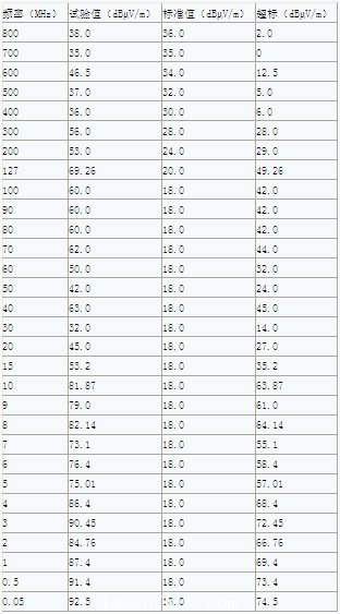 表2激光器電場輻射發(fā)射的數(shù)據(jù)與標準對比 頻率(MHz) 試驗值(dBμV/m) 標準值(dBμV/m) 超標(dBμV/m)