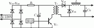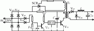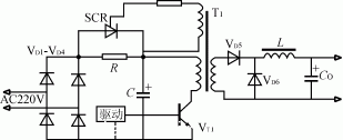 該電路如圖3所示。在電源瞬時(shí)接通時(shí),輸入電壓經(jīng)整流橋VD1VD4和限流電阻R對電容器C充電。當(dāng)電容器C充電到約80%的額定電壓時(shí),逆變器正常工作,經(jīng)主變壓器輔助繞組產(chǎn)生晶閘管的觸發(fā)信號,使晶閘管導(dǎo)通并短路限流電阻R,開關(guān)電源處于正常運(yùn)行狀態(tài)。