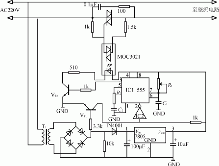 該電路如圖7所示。集成穩(wěn)壓器輸出穩(wěn)定的5V電壓,為軟起動(dòng)電路提供電源電壓。晶體管VT1、反相器IC2構(gòu)成過零觸發(fā)電路,IC1555構(gòu)成單穩(wěn)態(tài)觸發(fā)器,R1、C1為定時(shí)周期,但因5端至1端接有延遲電路R2、C2,所以555是逐步達(dá)到滿周期的。當(dāng)電網(wǎng)電壓過零時(shí),晶體管VT1截止,反相器IC2輸出低電平,起動(dòng)定時(shí)電路555工作,軟起動(dòng)延遲時(shí)間由時(shí)間常數(shù)R1C1及R2C2共同決定。