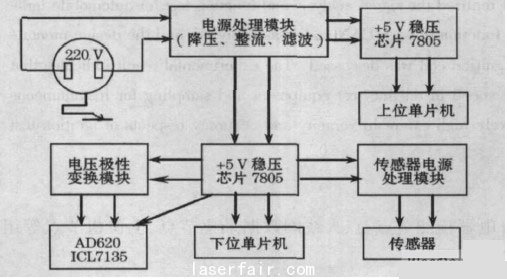 在主節(jié)點部分,通過總電源處理模塊,將交流220 V 轉換為直流12 V ,上位機的電源由自身的5 V 穩(wěn)壓模塊提供,通過總電源線將12 V 直流輸送到下位機,下位機及其外圍器件所需的電源都由下位機的電源模塊提供,個別器件所需的特殊電壓,由專用模塊獲得。