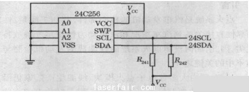 該模塊用來存儲下位機傳過來的壓力數(shù)據(jù)。系統(tǒng)對數(shù)據(jù)存儲器的基本要求是存儲容量要大,掉電數(shù)據(jù)不容易丟失,能保存較長時間,易于擴展容量?;谝陨弦?,選用了遵循總線串行擴展技術的24C256。單片機和24C256 之間的數(shù)據(jù)交換完全遵照IIC 總線的規(guī)定,即單片機作為主機,24C256 作為從機,所有操作都是由SDA 和SCL 2 個腳位的狀態(tài)(共有4 個狀態(tài):開始、停止、數(shù)據(jù)和應答) 來確定。24C256 和單片機的連接圖如圖8 所示。