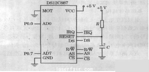 采用實時時鐘芯片DS12C887 為系統(tǒng)產(chǎn)生時間基準,它和單片機的連接如圖9 所示??僧斪鲉纹瑱C的外部RAM處理,通過P0 口對DS12C887 進行操作,通過其中斷引腳IRQ向單片機發(fā)出中斷,使單片機讀出時間。