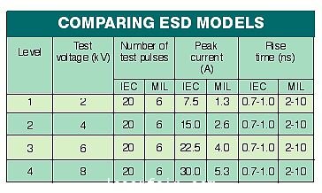 但是,明顯的瞬間電壓威脅和能量等級的不同存在于兩個模型之中。于是設計工程師可以使測試過程適合他們所期望的具體應用。例如,IEC1000-4-2具有一個非??焖俚碾娖矫}沖上升時間,能應用更多的脈沖和更高的峰值電流(見表格)。