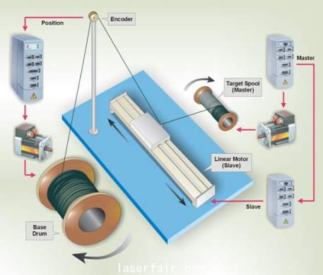 圖11為繞線機(jī)的應(yīng)用,其中一臺跟隨編碼器,完成ECAM功能,另兩臺驅(qū)動(dòng)器有一臺作為主,另一臺作為從,完成ECAM功能,因此在不需要控制器的情況下就可以完成繞線機(jī)的運(yùn)動(dòng)控制。