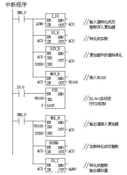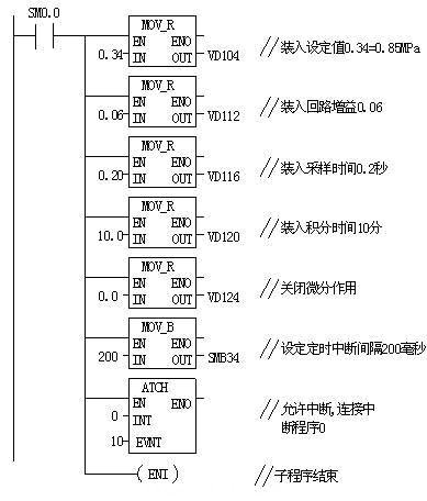 過程變量值是壓力變送器檢測(cè)的單極性模擬量,回路輸出值也是一個(gè)單極性模擬量用來控制鼓風(fēng)機(jī)的速度。這兩個(gè)模擬量的范圍是 0.0 -1.0 ,分辨率為1/32000 (標(biāo)準(zhǔn)化)??梢猿醪酱_定Kc=0.06,Ts=0.2,Ti=10.0,在這里不用微分作用,程序編輯如下圖。