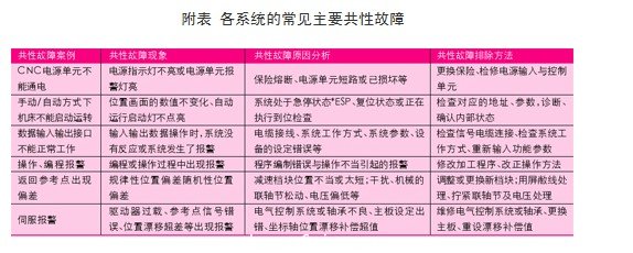 fanuc0系統(tǒng)的故障診斷與維修,可以分為根據(jù)系統(tǒng)所顯示的報(bào)警號(hào)、控制板指示燈狀態(tài)或i/o信號(hào)狀態(tài)、借助系統(tǒng)自診斷功能三種基本方法。各系統(tǒng)的常見主要共性故障如附表。